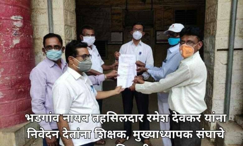 भडगांव तालुका माध्यमिक व उच्च माध्यमिक शाळांचे नियुक्त शिक्षक शिक्षकेतर कर्मचारी यांना शासन आदेशानुसार कोव्हिड १९ कामकाजातुन कार्यमुक्त करावे. या मागणीचे निवेदन माध्यमिक शिक्षक संघ,मुख्याध्यापक संघाचे जिल्हा अध्यक्ष-जे.के.पाटील यांच्या मार्गदर्शनाखाली नायब तहसीलदार रमेश देवकर यांना निवेदन देण्यात आले. तहसिलदारांना दिलेल्या निवेदनात नमुद केले आहे कि,शालेय कर्मचार्यांना कोव्हिड १९ काम काजातुन कार्यमुक्त करण्या बाबतचे शासन आदेश झालेले आहेत. शिक्षकांनी विदयार्थ्यांना ऑनलाईन,ऑफलाईन अध्यपना बरोबर वैयक्तीक गृहभेटी देउन अभ्यासाबाबत मार्गदर्शन करणे आवश्यक आहे. तसेच या कामकाजासाठी नियुक्त शालेय कर्मचार्यांना गृहविलीगीकरणासाठी पुरेसा कालावधी मिळणे आवश्यक आहे.माध्यमिक शाळेतील शिक्षक, शिक्षकेतर कर्मचार्यांना सेवा कोव्हिङ १९ च्या कामकाजासाठी अधिग्रहीत केल्या आहेत. त्यांना कार्यमुक्त करावे असेही शेवटी निवेदनात नमूद केलेले आहे.