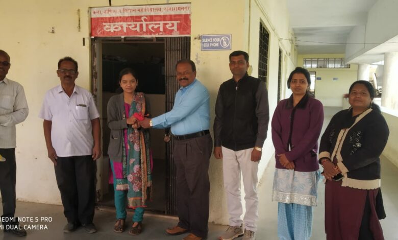 कर्म.रा.स. वाघ शैक्षणिक व आरोग्य संस्थेचे कला वाणिज्य व विज्ञान महाविद्यालय राजारामनगर येथील वाणिज्य शाखेतील कुमारी मनीषा अंबादास ठोंबरे Ty bcom या विद्यार्थिनीने शैक्षणिक वर्ष 2020-21 मध्ये घेतलेल्या TY BCom च्या परीक्षेत विद्यापीठ गुणवत्ता क्रमवारीत 5 क्रमांक मिळविला आहे त्याबद्दल तिचा संस्थेचे अध्यक्ष मा. श्रीराम शेटे साहेब संस्थेचे सचिव बाळासाहेब उगले यांच्याकडून तिचा सत्कार करण्यात आला.या संस्थेचे अध्यक्ष म्हणाले की,ग्रामीण भागातील विद्यार्थीनी गुणवत्ता यादीत झळकणे हे कौतुकास्पद आहे.त्यामुळे इतर विद्यार्थ्यांना प्रेरणा मिळेल.हे यश मिळविण्यासाठी साठी महाविद्यालयाचे प्राचार्य डॉ.जाधव सर, वाणिज्य विभाग प्रमुख प्रा.अविनाश सोनवणे ,प्रा. नंदू गवळी, प्रा.सुजाता पाटील ,प्रा.इन्द्रेकर सर इतर प्राध्यापक यांचे मार्गदर्शन लाभले.