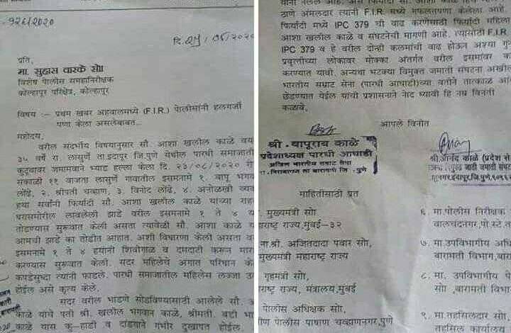 निवेदनात 1) बापू भगवान लोंढे 2)श्रीपती चव्हाण 3) विनोद लोंढे 4) अनोळखी व्यक्ती ह्यांचावर कायदेशीर कडक कारवाई करून त्या गुन्ह्यात 379 वाढ करून त्यावरील आरोपीवर मोक्काअंतर्गत कारवाई करण्यात यावे या आशयाचे निवेदन भटकया विमुक जमाती संघटनेचे प्रदेश सचिव श्री आंनद काळे यांनी विविध मान्यवरांना पाठविल्या आहेत.निवेदनावर अखिल भारतीय सम्राट सेना(पारधी आघाडी) प्रदेश अध्यक्ष श्री बापूराव काळे,आकाश भोसले,सागर काळे ,नियोजन भोसले, अभिजित काळे भगवान भोसले,लखन काळे,नितीन शिंदे आदी कार्यकर्त्यांच्या सहीने पाठविले आहेत.