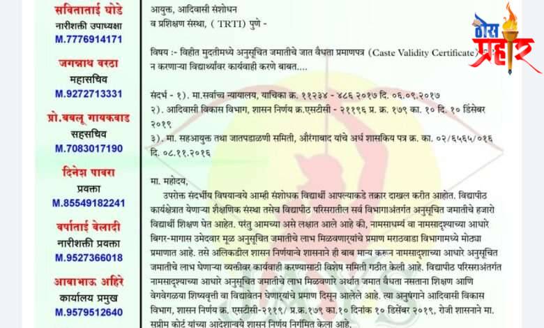 निवेदनात म्हटले आहेत की विद्यापीठ कार्यक्षेत्रात येणाऱ्या शैक्षणिक संस्था तसेच विद्यापीठ परिसरातील सर्व विभागाअंतर्गत अनुसूचित जमातीचे हजारो विद्यार्थी शिक्षण घेत आहेत. परंतु आमच्या असे लक्षात आले आहे की, नामसाधर्म्य वा नामसादृश्याच्या आधारे बिगर-मागास उमेदवार मूळ अनुसूचित जमातीचे लाभ मिळवणार्यांचे प्रमाण मराठवाडा विभागामध्ये मोठ्या प्रमाणात आहे. तसे अलिकडील शासन निर्णयान्वे शासनाने ही बाब मान्य करून नामसादृशाच्या आधारे अनुसूचित जमातीचे लाभ घेणाऱ्या व्यक्तीवर कार्यवाही करण्यासाठी विशेष समिती गठीत केली आहे. विद्यापीठ परिसराअंतर्गत नामसादृश्याच्या आधारे अनुसूचित जमातीचे लाभ मिळवणारे अर्थात जमात वैधता नसताना शिक्षण आणि वेगवेगळया शिष्यवृत्ती वा विद्यावेतन घेणार्यांचे प्रमाण दिसून आलेले आहे. त्या अनुषंगाने आदिवासी विकास विभाग, शासन निर्णय क्र. एसटीसी-२११९/ प्र.क्र.१७९ का.१० दिनांक १० डिसेंबर २०१९, रोजी शासनाने मा. सुप्रीम कोर्ट यांच्या आदेशान्वये शासन निर्णय निर्गमित केला आहे.