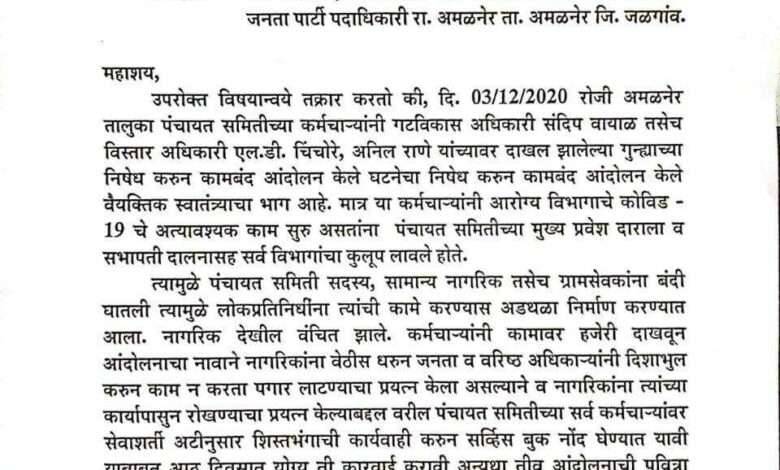 गटविकास अधिकारी संदीप वायाळ यांच्या विरुद्ध गुन्हा दाखल झाल्याच्या विरोधात कर्मचारीनी काम बंद आंदोलन केले आंदोलनाबाबत पंचायत समिती सदस्य आणि भाजप पदाधिकारींचा आक्षेप नाही मात्र कर्मचाऱ्यांनी हजेरी लावून पंचायत समितीच्या मुख्य प्रवेशद्वार तसेच विविध विभागाच्या दरवाज्याना कुलूप लावले त्यामुळे पंचायत समिती सदस्यांना आणि नागरिकांना तसेच दिव्यांग व्यक्तींना पंचायत समितीत प्रवेश करण्यास अडथळा निर्माण करण्यात आला आज दिव्यांग दिन असंल्यामुळे त्यांच्या मागणीसाठी त्यांना प्रवेश मिळाला नाही , लोकप्रतिनधीना जनतेला न्याय देण्यासाठी हेतुपुरस्कार अडथळा करण्यात येऊन जनतेच्या कामांना व्यत्यय निर्माण करून त्यांना त्यांच्या हक्कांपासून वंचित ठेवण्यात आले कर्मचाऱ्यांनी हजेरी लावून आंदोलनाबाबत दिशाभूल केली व पगार लाटण्याचा प्रयत्न केला म्हणून त्यांच्याविरुद्ध शिस्तभंग कारवाई करून सेवा पुस्तकात नोंद घेण्यात यावी अन्यथा आठ दिवसात आंदोलन छेडले जाईल असा इशारा सभापती रेखाताई पाटील , उपसभापती भिकेश पाटील , पंचायत समिती सदस्य कविता पाटील , त्रिवेणीबाई शिवाजी पाटील , वजाताई नामदेव भिल या पंचायत समिती सदस्य व माजी सभापती श्याम अहिरे , भाजप तालुकाध्यक्ष हिरालाल पाटील ,राकेश पाटील , शीतल देशमुख , बाजार समिती सभापती प्रफुल पाटील, प्रकाश पाटील , मच्छीन्द्र पाटील,सरपंच शरद पाटील,संजय पाटील,दिपक पाटील,राहुल चौधरी,पतींग पाटील,किरण पवार ग्रा प सदस्य,मिलिंद पाटील,सरपंच मायाबाई वाघ,शिवाजी पाटील,भाऊसाहेब पाटील,गुलाब खाटीक यांनी केली आहे