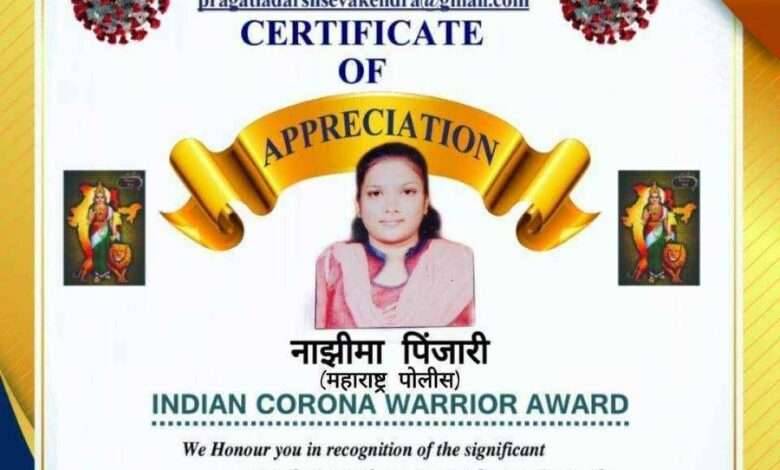 महिला पोलीस नाझीम पिंजारी बिहारच्या सामाजिक संस्थेचा कोरोना योद्धा पुरस्काराने सन्मानीत